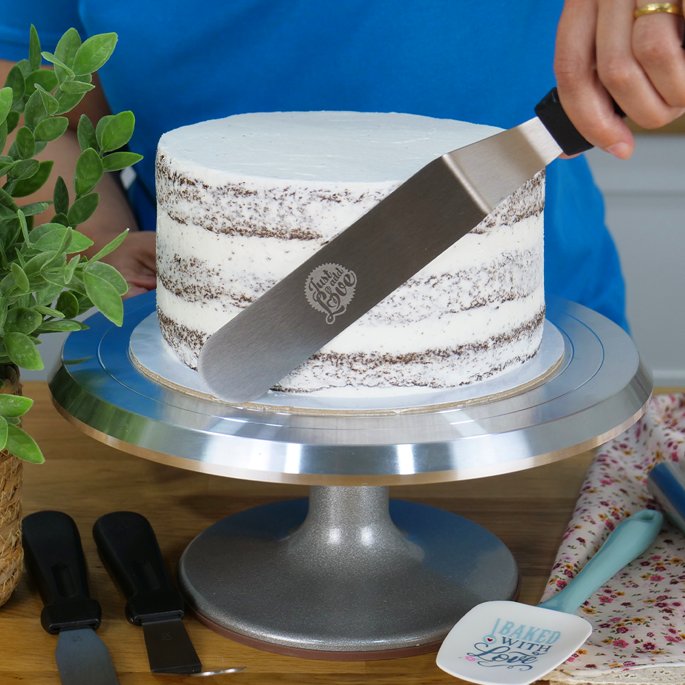 Espátula curva com lâmina em aço inoxidável e cabo de plástico para trabalhos em pastelaria ou cozinha. Apta para uso alimentar. Pode ir à máquina de lavar.