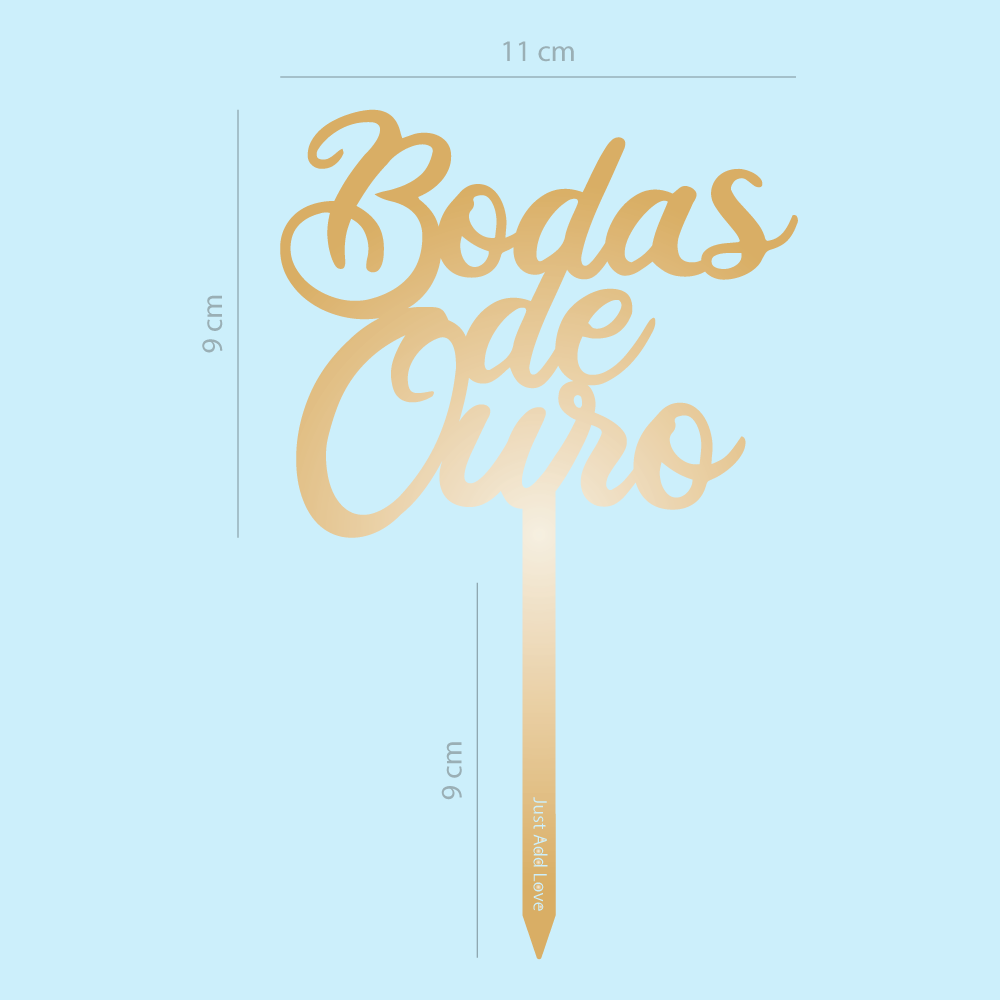 Toppers de Bolo para Bodas - Um Toque de Amor e Elegância Celebre o amor em grande estilo com nossos toppers para Bodas de Ouro. Com um design sofisticado e acabamentos elegantes, são ideais para destacar bolos em momentos únicos e cheios de significado. São laváveis e reutilizáveis. Fabricado em acrílico com espessura de 3mm. Embalagem com 1 unidade.
