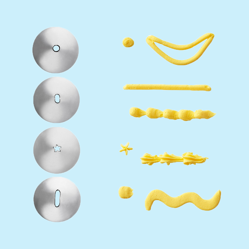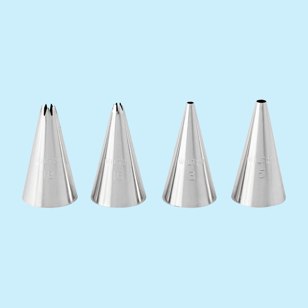 Conjunto de 4 bicos de pasteleiro em aço inoxidável. Pode ser usado sem adaptador. Ideal para decoração de bolos, cupcakes, bolachas, sobremesas, entre outros. Pode ser lavado na máquina de lavar. Embalados individualmente.