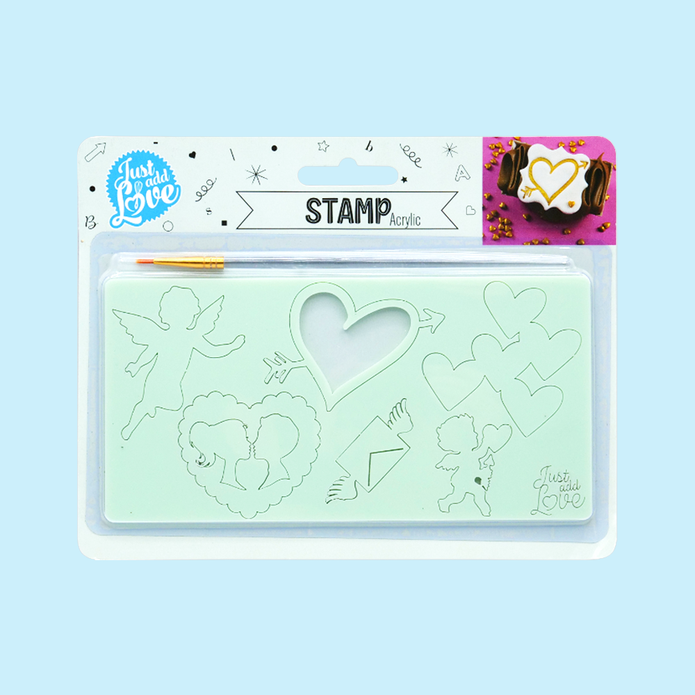 Carimbo em acrílico, apto para uso alimentar.
