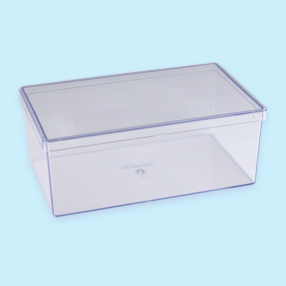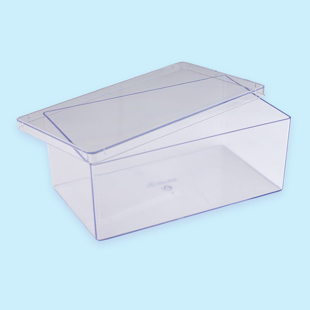 Caixa quadrada com tampa, feita em poliestireno cristal (material mais resistente do que acrílico).