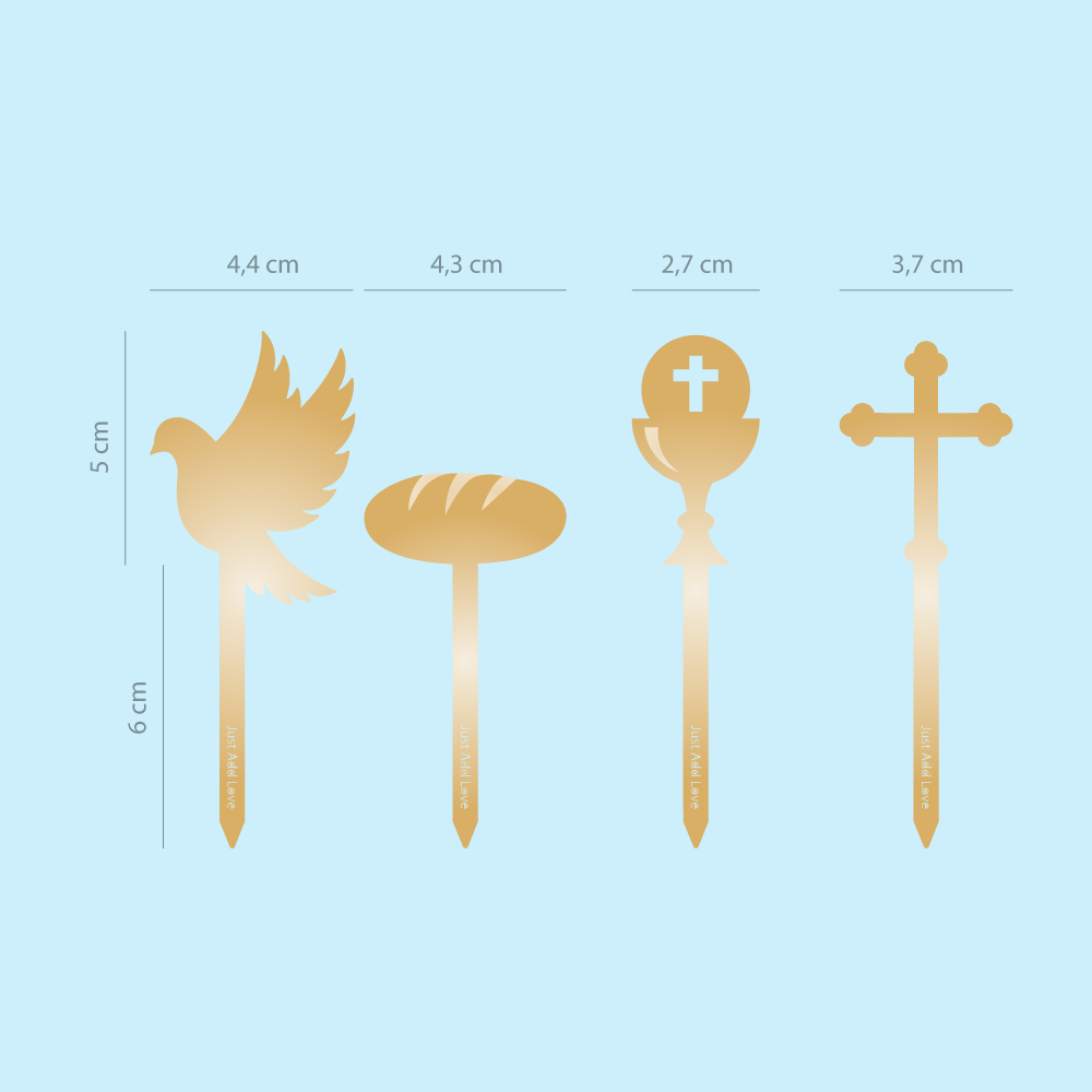 Os nossos toppers são perfeitos para bolos de Comunhões, Batizados, Profissões de Fé, Crisma trazendo um toque delicado, moderno e cheio de simbolismo.