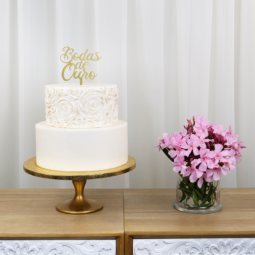 Toppers de Bolo para Bodas - Um Toque de Amor e Elegância Celebre o amor em grande estilo com nossos toppers para Bodas de Ouro. Com um design sofisticado e acabamentos elegantes, são ideais para destacar bolos em momentos únicos e cheios de significado. São laváveis e reutilizáveis. Fabricado em acrílico com espessura de 3mm. Embalagem com 1 unidade.