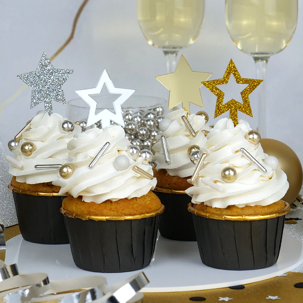 Dê um toque de brilho e elegância às suas celebrações! Os nossos toppers em forma de estrelas douradas e prateadas são ideais para decorar cupcakes, bolos, sobremesas e outras especialidades festivas. Com um design sofisticado e versátil, combinam perfeitamente com vários tipos de eventos, desde aniversários a festas temáticas. São laváveis e reutilizáveis. Fabricado em acrílico com espessura de 3mm. Embalagem com 4 unidades.