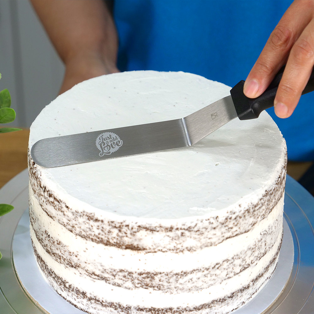 Espátula curva com lâmina em aço inoxidável e cabo de plástico para trabalhos em pastelaria ou cozinha. Apta para uso alimentar. Pode ir à máquina de lavar.