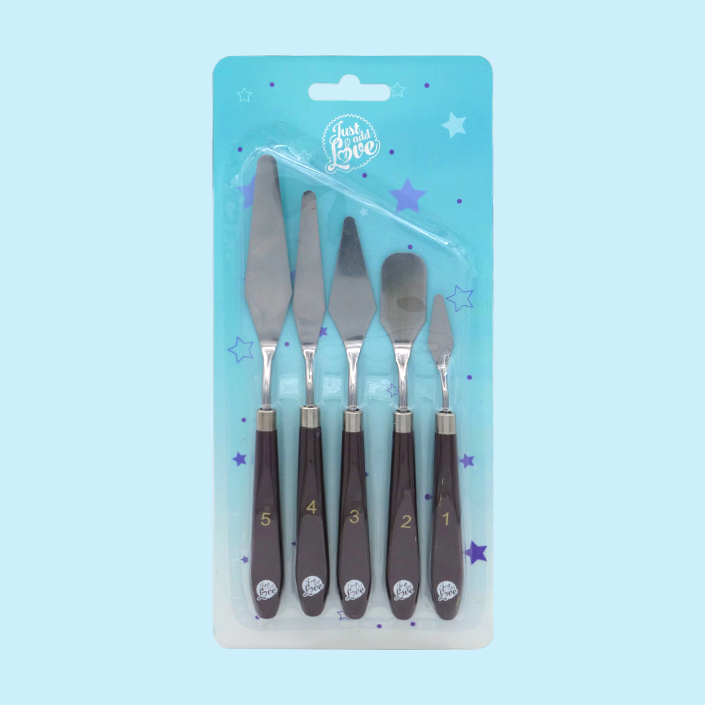 Conjunto com 5 espátulas pequenas. A ferramenta essencial para decoração de bolos, cupcakes, bolachas, cakepops, cakesicles, entre outros. Contém cabo de plástico, lâmina em aço inoxidável desenhadas especificamente para uso em produtos alimentares.