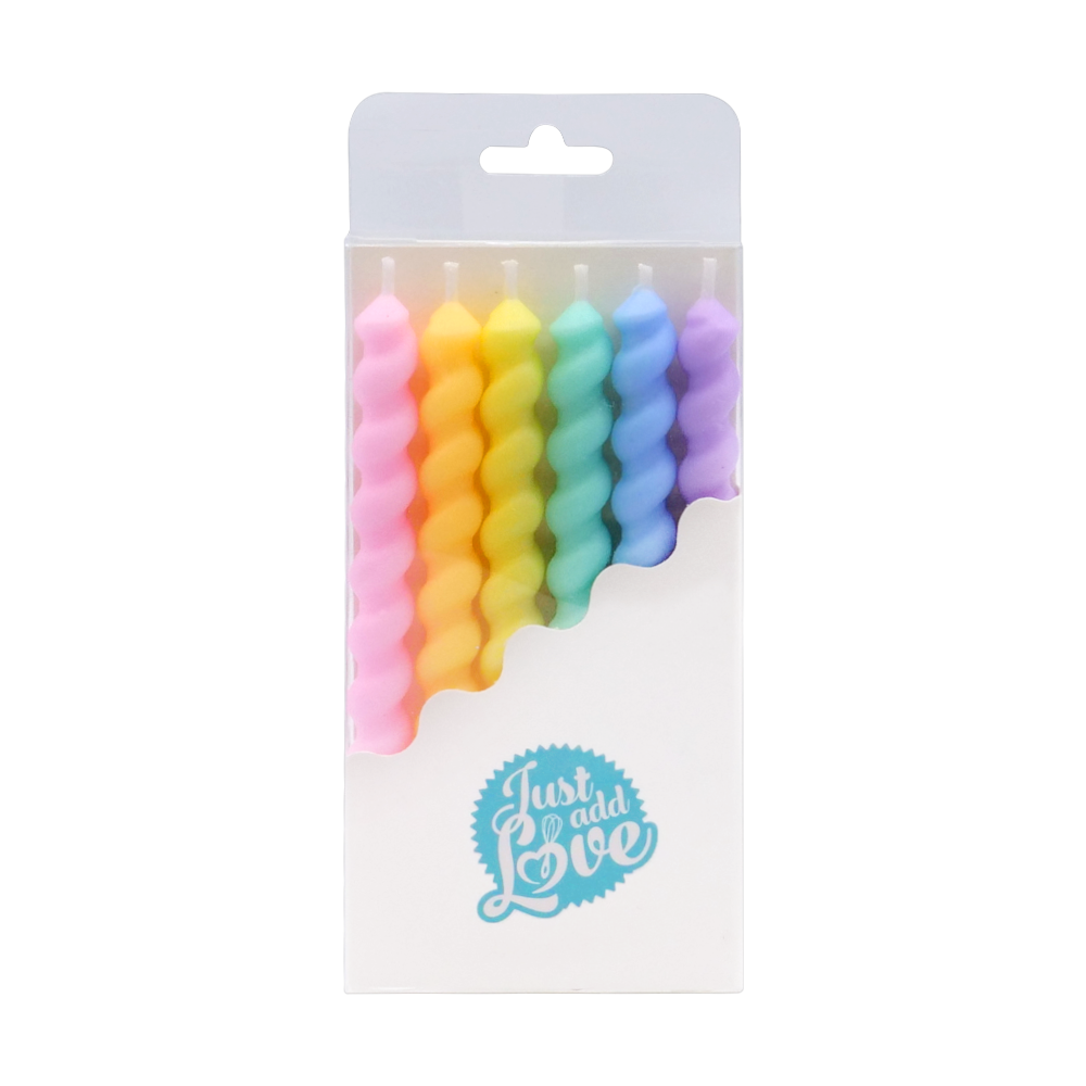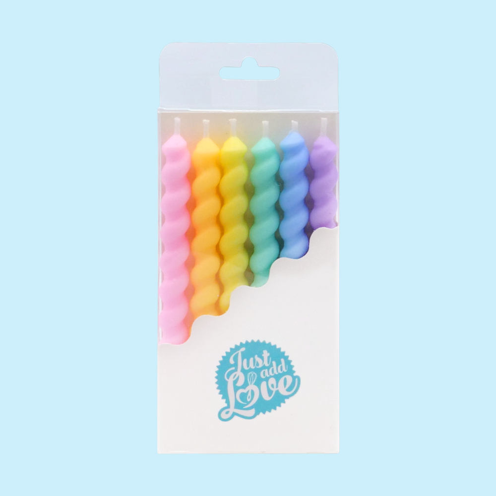 Conjunto com 6 unidades de velas torcidas em cores pastéis que combinam elegância e delicadeza.